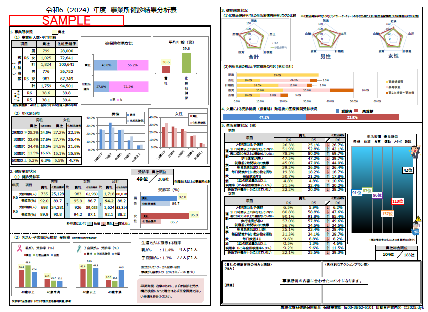 当健康保険組合では、被保険者の健診結果を加入事業所ごとに集計し、健診受診状況や健康・生活習慣の傾向を数値化した「事業所健診結果分析表」を作成しております。